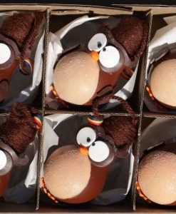 Bufnita glob brad – Acesta este bec vopsit manual iar ochii, aripile si picioarele sunt modelate din lut polimeric usor flexibil..